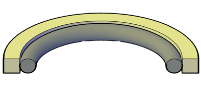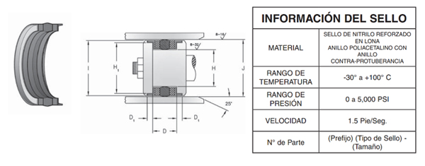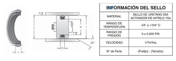 Este sello está moldeado con poliuretano de dureza Shore A 93 con un energizador de dureza Shore A 70 y utiliza las mismas dimensiones de ranura que los sellos en T y los o-ring estándar.